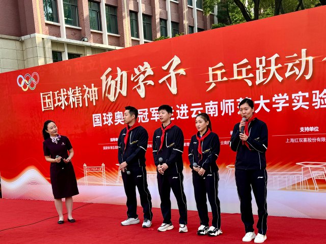 4月8日,云南师范大学与中国乒乓球队携手开展“国球奥运冠军进校园”活动。上午,乒乓球奥运冠军马龙、许昕、刘诗雯、李晓霞一行,走进云南师范大学实验中学、云南师范大学一二一校区,与师生一起升国旗、面对面交流,还参观了西南联大旧址。此次活动以国球文化为纽带,传承弘扬红色基因,将西南联大“刚毅坚卓”的精神与乒乓“永不言弃”的拼搏精神深度融合,搭建体教融合创新平台。下午,奥运冠军走进云南师范大学呈贡校区,为师生带来“思政大讲堂”。