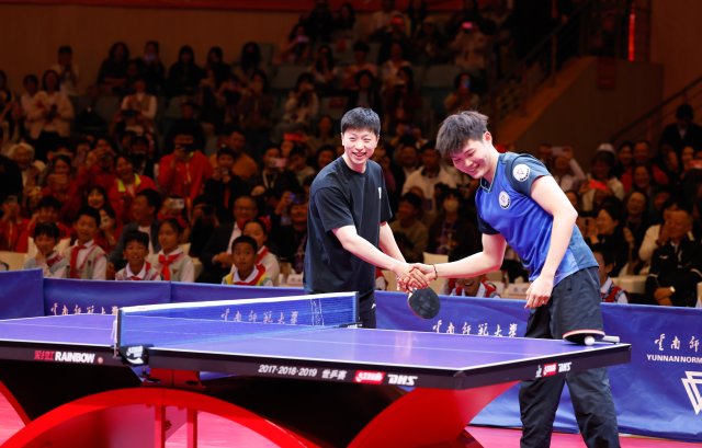 由清华大学、北京大学、南开大学以及云南师范大学学生代表组成的西南联大队和四位奥运冠军进行了一场精彩的表演赛。第一局由马龙出战,和云南师范大学学生代表进行切磋,一脸轻松的马龙开局连输3分,作为解说的刘诗雯表示,高原由于海拔问题球速较快,龙队还没有适应环境。首局西南联大队旗开得胜,先得一分。随后,刘诗雯和李晓霞分别与清华大学、北京大学的学生代表切磋,双方比分交替领先,最后一局,“黄金左直”许昕战胜了西南联大队外援代表。