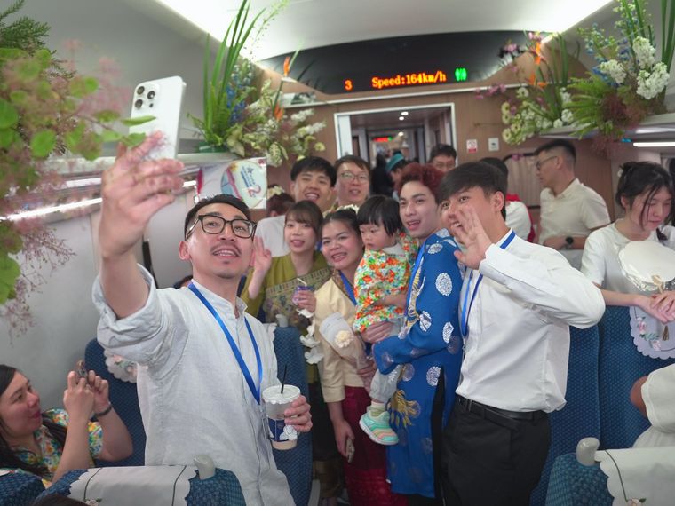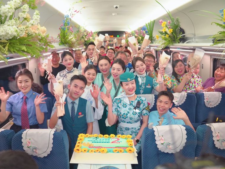 工作人员与旅客欢庆中老铁路国际旅客列车开行两周年。通讯员周涛 摄