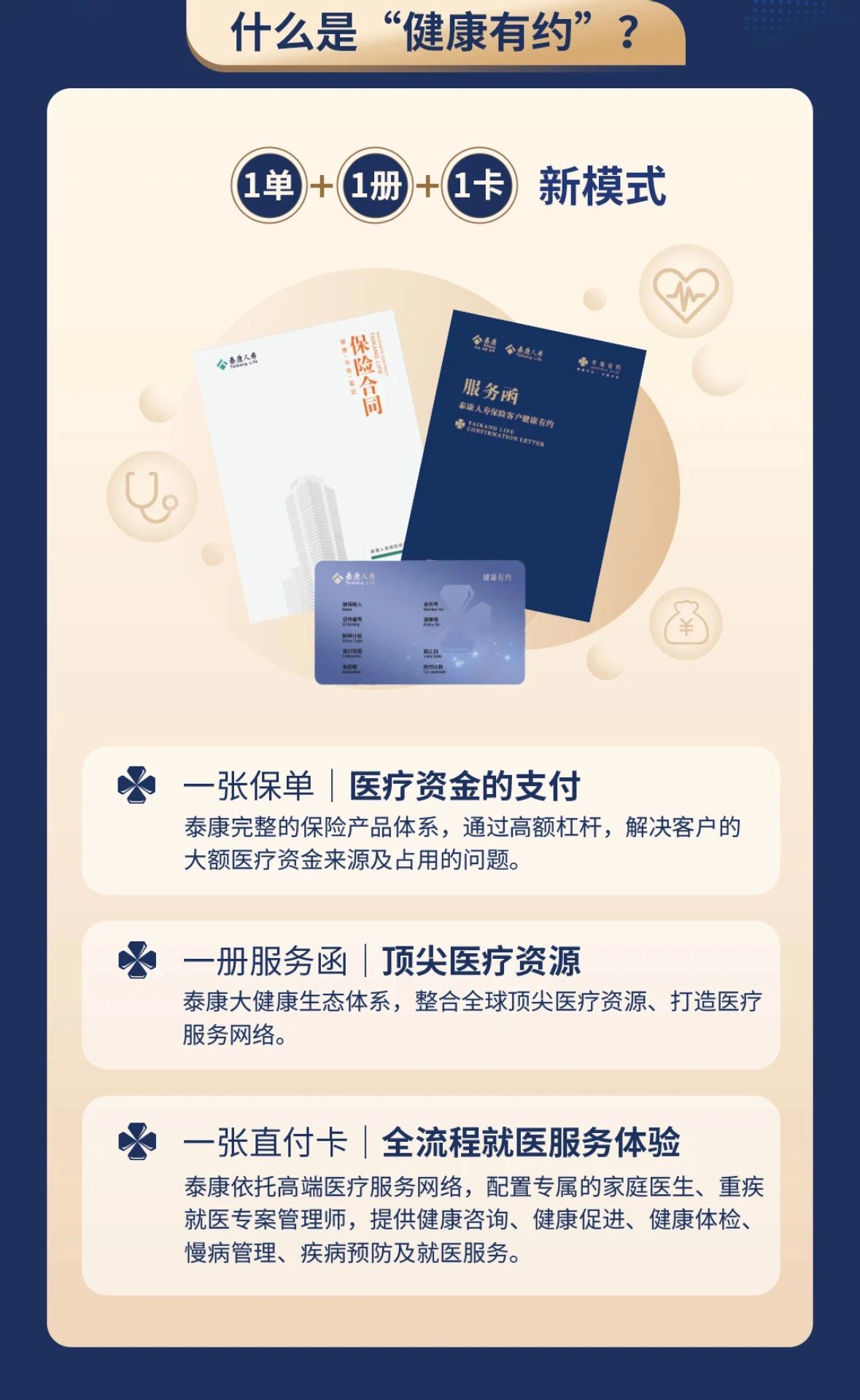 作为泰康高品质医疗险的核心产品线,“健康有约”依托“幸福有约”全周期体系,以泰康自建专业医疗团队和医养实体机构为核心,汇集泰康投资及合作医疗资源,丰富了“幸福有约”的产品、服务及品牌内涵,也打通了泰康共建健康闭环的重要环节,为客户带来长寿时代下更安心、便捷的健康保障。
