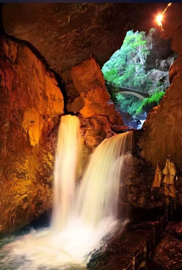 继续前行,便能看到雌雄飞瀑。两条瀑布从三十多米高的悬崖上奔腾而下,气势磅礴,震耳欲聋。枯水季节,它们潺潺流淌,宛如一对温柔的情侣;洪水季节,两瀑合二为一,似一条咆哮的巨龙,展现出大自然雄浑壮丽的一面,这也是国内洞穴中仅有的一大奇观。