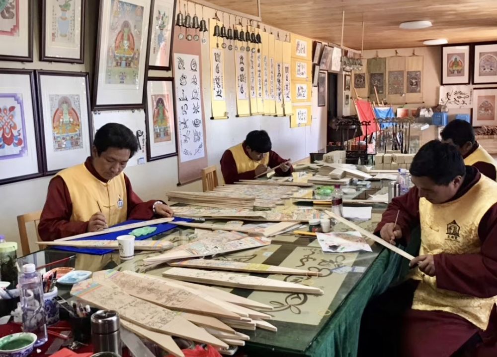 和华强与徒弟共同制作东巴木牌画。(供图)