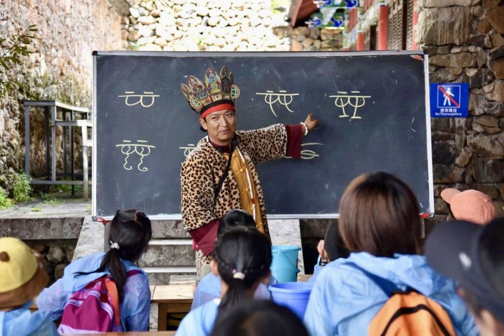 他带着徒弟将东巴图腾融入茶具、丝巾、团扇,让“神鹿”“莲花”走进现代生活;在中小学校开设东巴画课程,孩子们用稚嫩的笔触画下“风、云、爱”;玉水寨的文旅融合项目中,游客不仅能观赏东巴画,还能体验一幅东巴画的诞生。