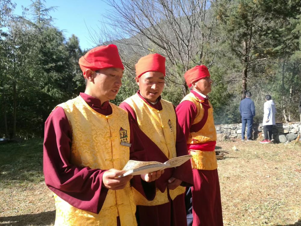 和华强与同事念诵东巴经。(供图)