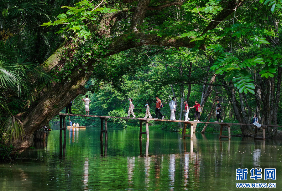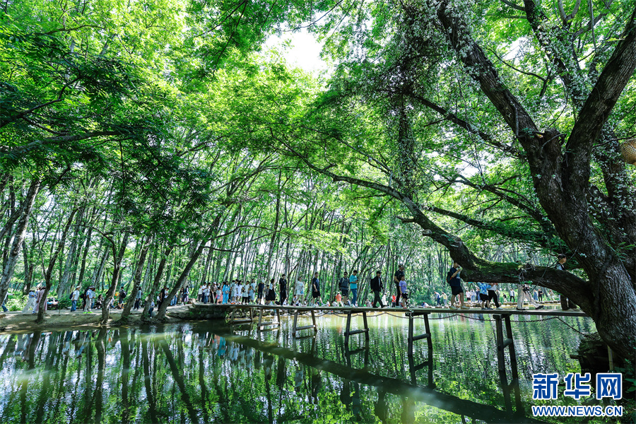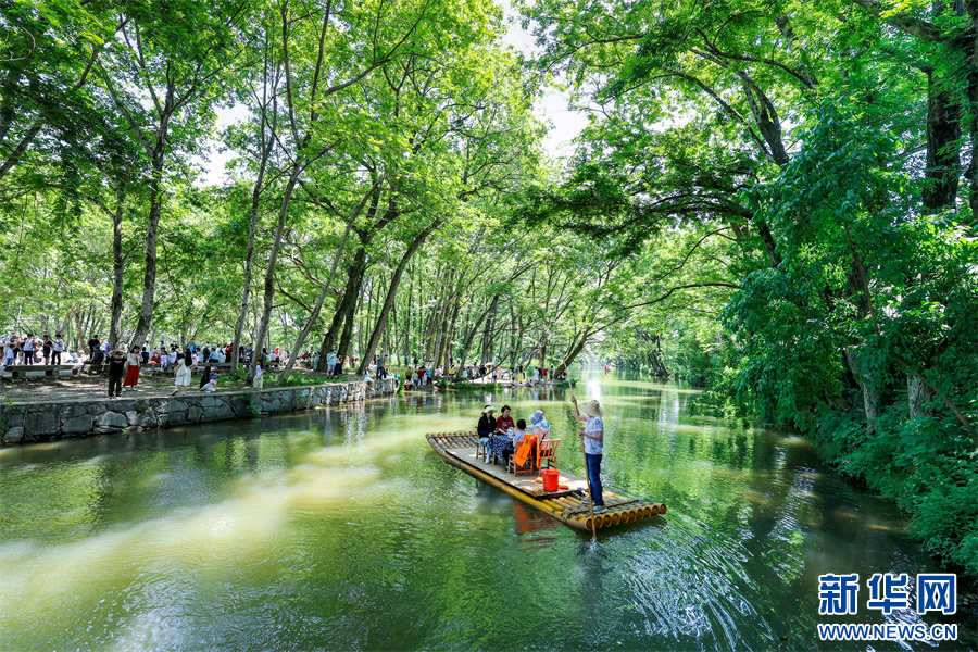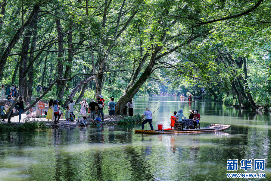“五一”假期,安徽省黄山市徽州区西溪南湿地风景旖旎,枫杨林郁郁葱葱,与延绵流淌的丰乐河相映成趣,如诗如画的生态美景吸引众多游客前来游玩,乐享假日时光。