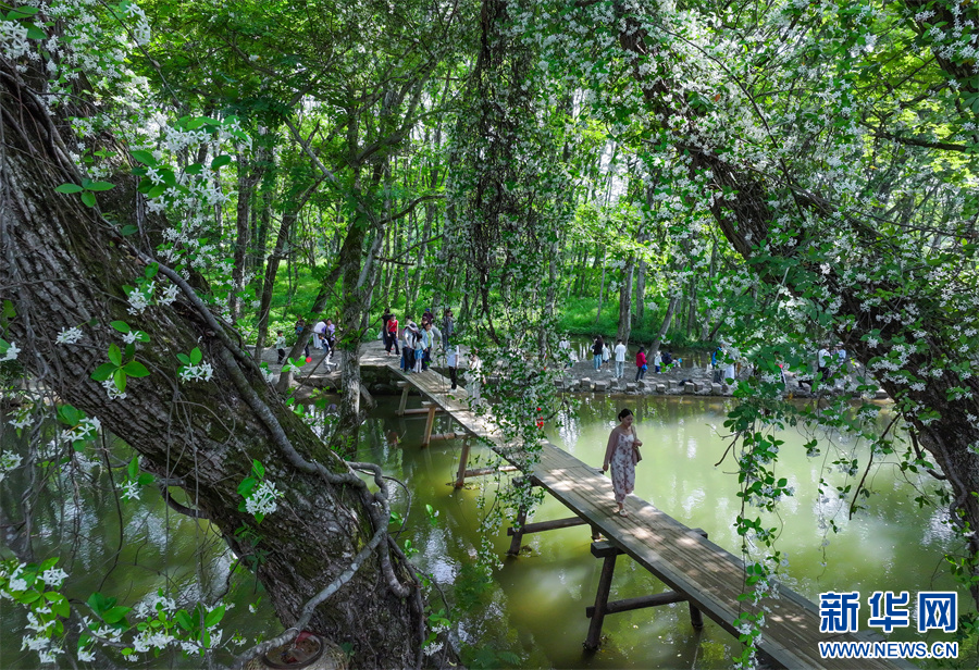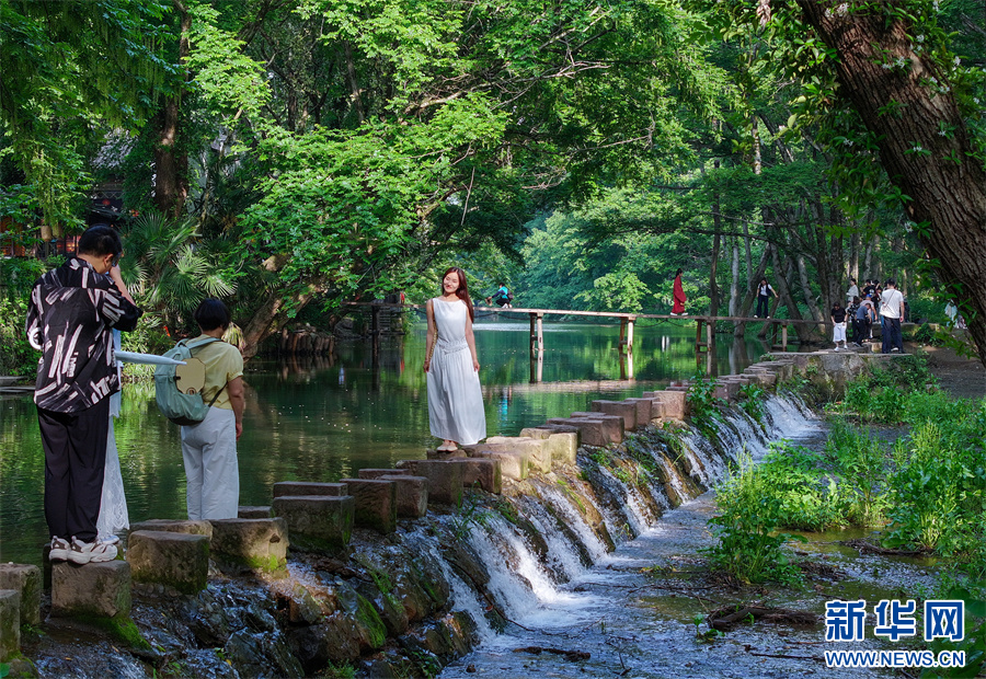 5月1日,游客在安徽省黄山市徽州区西溪南村游玩赏景。新华网发(施亚磊 摄)