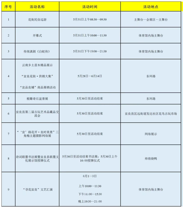 活动期间,当地将举办花街民俗巡游、乡土苗木精品展、根雕奇石盆景展、三角梅主题摄影网络展、传统滇剧《白蛇传》汇演、“宜品良铺”农特产品展等,特别是云南乡土苗木精品展,将集中展示三角梅、山茶、绣球等“宜良制造”花卉苗木,展示宜良作为“中国花卉苗木之城”的产业优势。