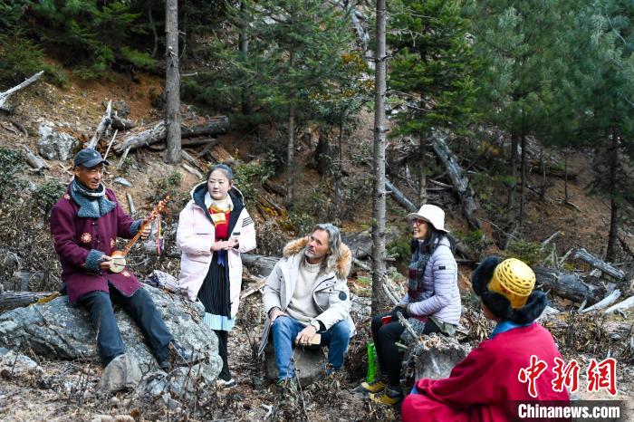 深入白马雪山国家级自然保护区的林间小道,一小支由中外登山者组成的徒步队伍正向雪山观景位前行。玉杰村村民达瓦此里是小队向导,一路上,身着藏装的他一面导航,一面讲解着当地的煨桑仪式、锅庄舞蹈和古老建筑。