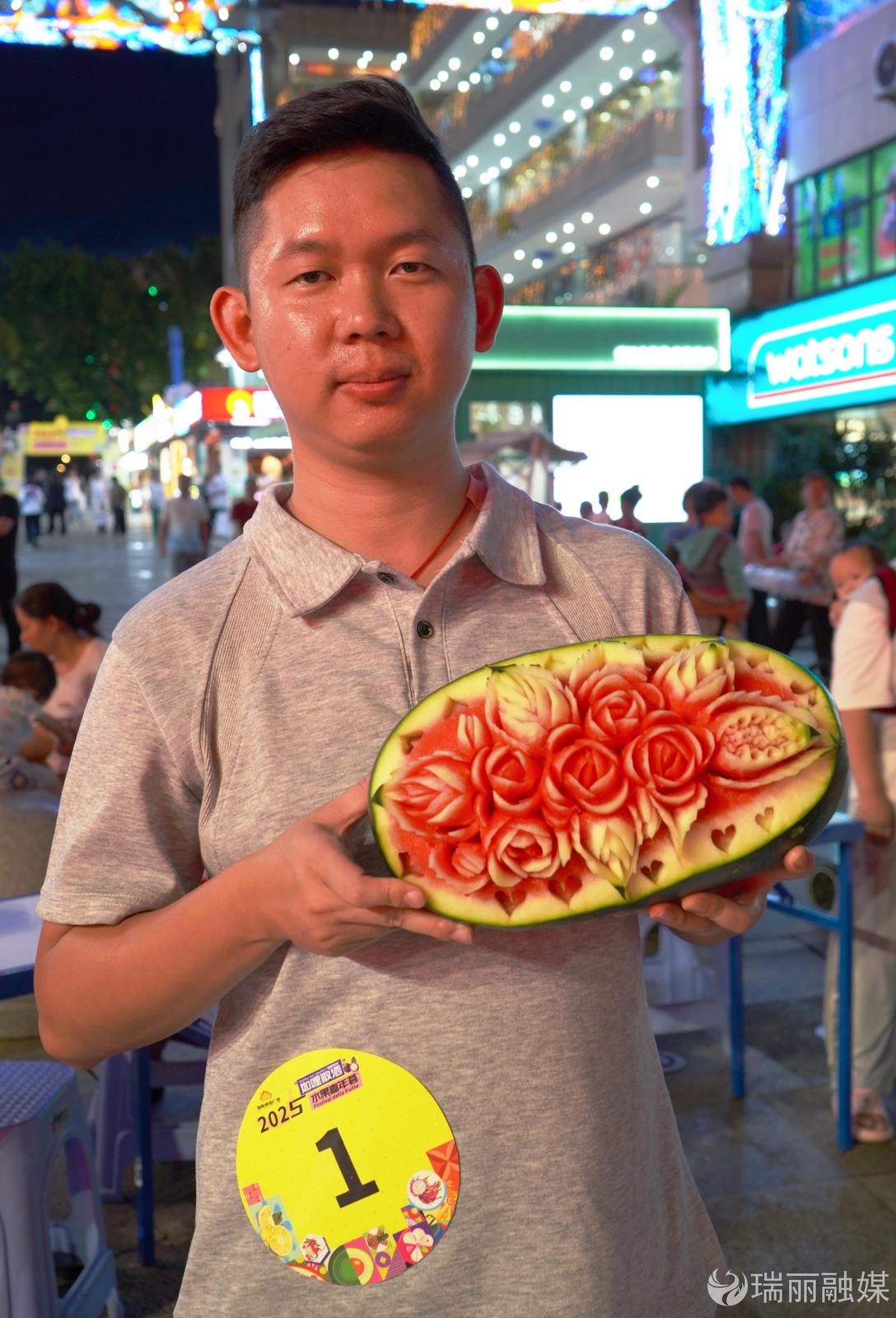 大赛以“‘如哩散洒’巧手雕果,匠心传承”为主题,吸引了众多果雕爱好者同台竞技。选手们以西瓜、哈密瓜、苹果等为原料,凭借精湛刀工与奇思妙想完成作品。经评委团专业评审,选手张彬摘得金奖。