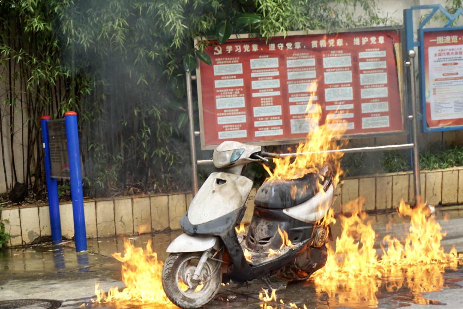 电动自行车燃烧过程中产生大量刺鼻浓烟。