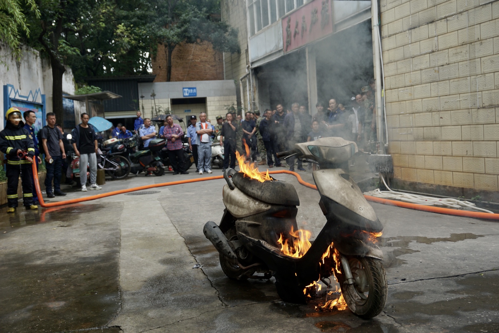现场进行电动自行车燃烧实验。