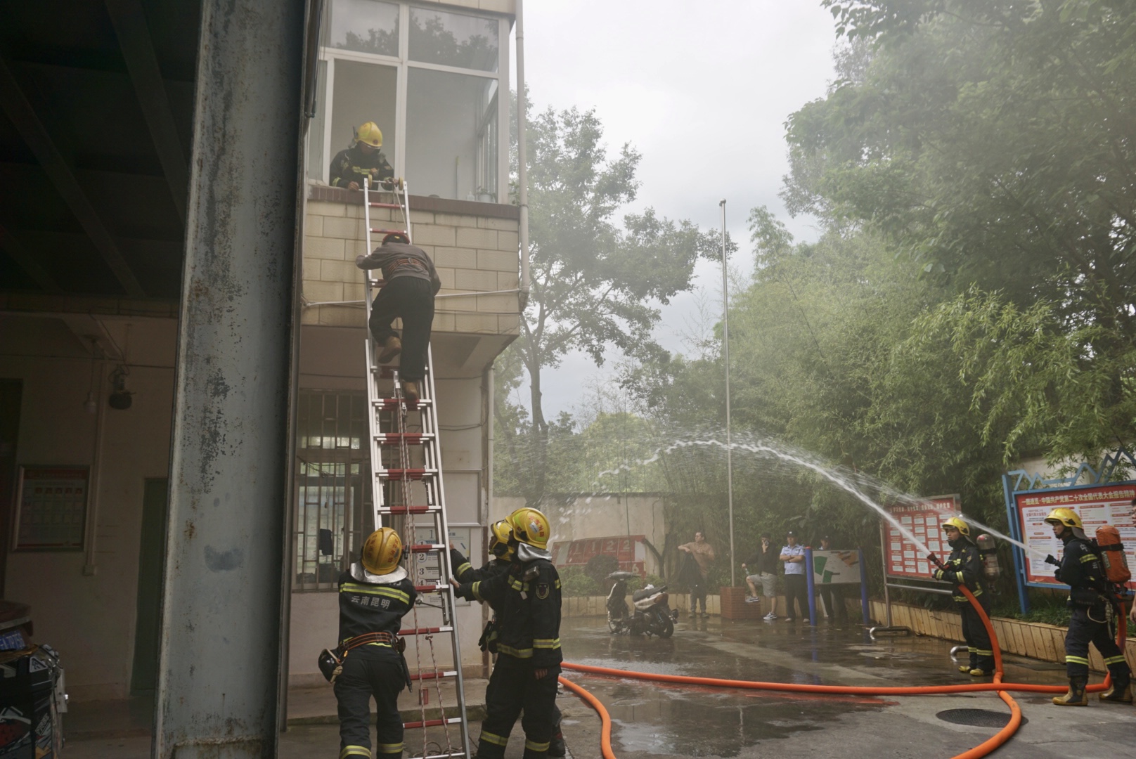 为了让参训人员更深刻地感受到火灾发生过程中烟气带来的危害,以及火场被困救援过程,理论培训结束后,还进行了电动自行车燃烧实验和火场逃生演练。当电动自行车燃烧以后,浓烈刺鼻的烟味让现场人员纷纷捂住口鼻。逃生演练环节,模拟和平社区办公楼1楼着火,2楼有人员被困。消防员接警后迅速到达现场展开救援,随后,外围压制控火、沿楼层铺设水带内攻、爬梯疏散救援等科目逐一展开,让在场人员充分了解了消防救援的全过程,体验了“火场”等待救援的紧张时刻,让抽象的消防知识变得可感可触、可学可用。