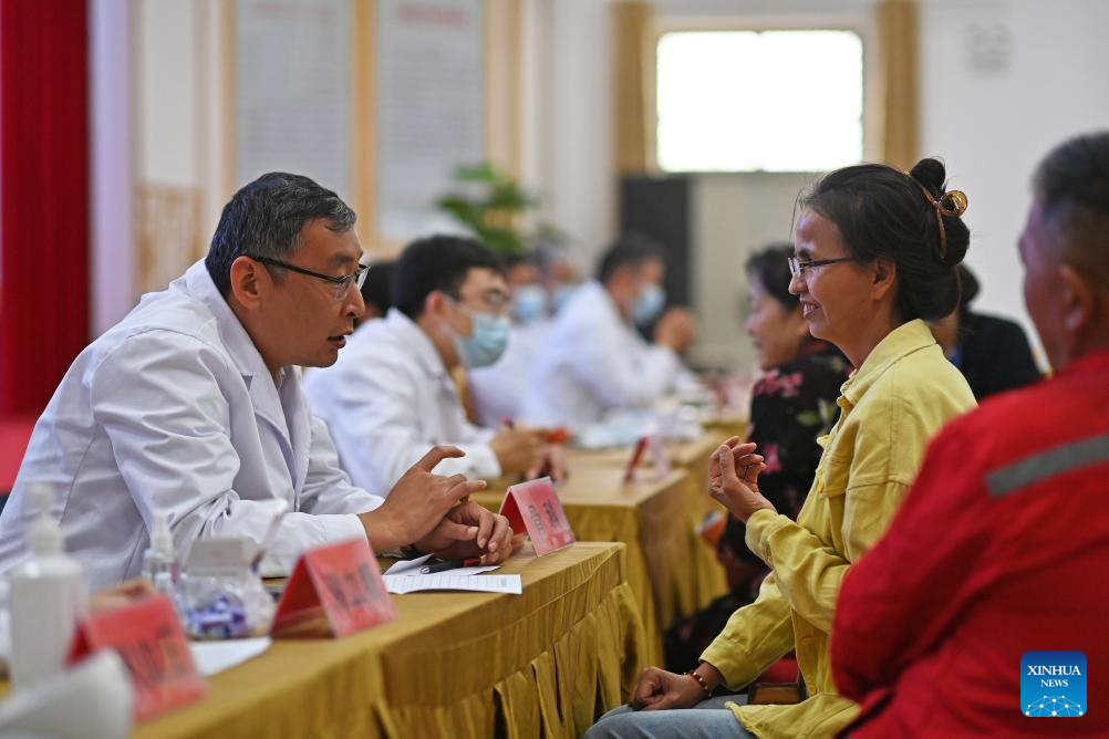 A doctor from Tiemenguan City conducts free clinical treatment to a local villager in Daxi Village of Yuli County, Mongolian Autonomous Prefecture of Bayingolin, northwest China's Xinjiang Uygur Autonomous Region, Sept. 19, 2025. People in Daxi Village of Yuli County used to live a poor life due to the harsh natural environment and limited means of living. In recent years, local authorities have made efforts to develop tourism and e-commerce to promote rural development, which has brought more income for local villagers. (Xinhua/Wang Fei)