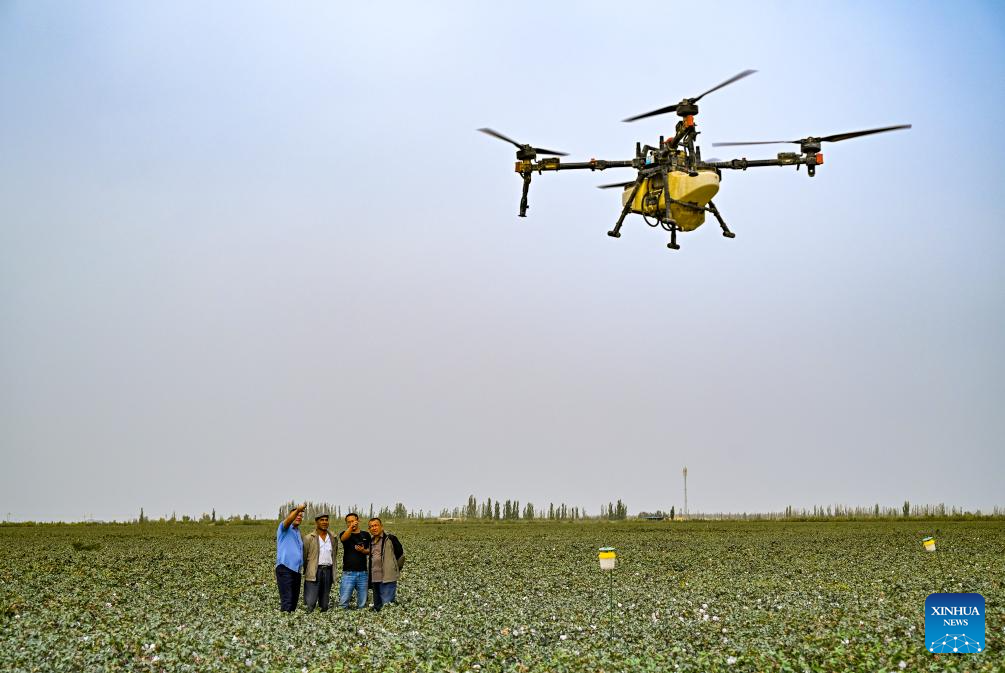 Ai Haipeng (2nd R), manager of an agriculture pilot program, conducts a training on spreading pesticides with an intelligent drone on a cotton field in Daxi Village of Yuli County, Mongolian Autonomous Prefecture of Bayingolin, northwest China's Xinjiang Uygur Autonomous Region, Sept. 19, 2025. People in Daxi Village of Yuli County used to live a poor life due to the harsh natural environment and limited means of living. In recent years, local authorities have made efforts to develop tourism and e-commerce to promote rural development, which has brought more income for local villagers. (Xinhua/Chen Shuo)