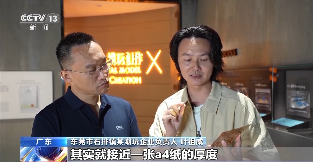 东莞市石排镇某潮玩企业负责人叶祖威:因为市面上通用的着色的工艺,多次折弯的情况下,表面的金属着色它会掉。我们自主在研发抗扭弯的着色工艺。