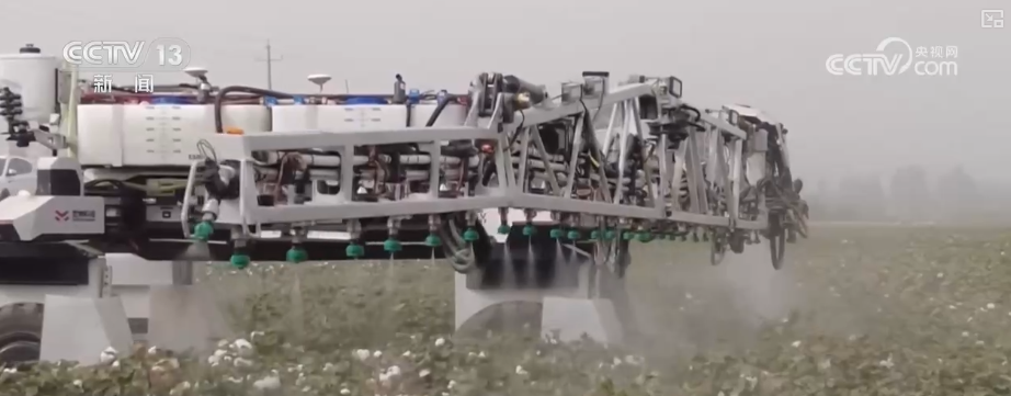在阿拉尔市塔南镇的棉田里,洁白的棉桃开始吐絮,一台犹如展开双翼的智能喷施机器人正在棉田中快速“奔走”,均匀、精准地喷施脱叶剂。