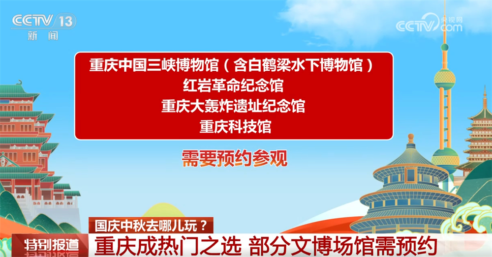 重庆全市文博场馆,除重庆中国三峡博物馆(含白鹤梁水下博物馆)、红岩革命纪念馆、重庆大轰炸遗址纪念馆、重庆科技馆需预约参观以外,其他博物馆取消参观预约要求。部分博物馆将延长开放时间,具体时间请关注各博物馆官方网站及公众号。