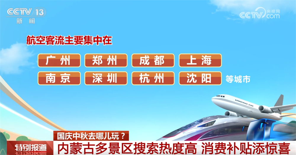 自驾游成为出行主流。航空客流主要集中在广州、郑州、成都、上海、南京、深圳、杭州、沈阳等城市。此外,内蒙古还推出总计1000万元电影消费补贴,用户最高可领取60元电影消费券。