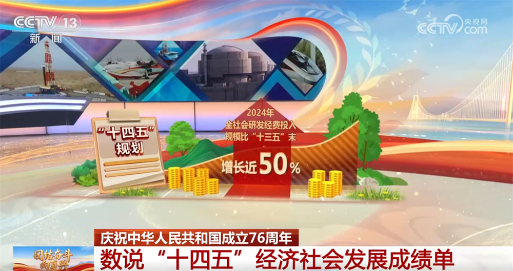 “十四五”规划把创新提到前所未有的重要位置,我国研发投入再创新高,2024年全社会研发经费投入规模比“十三五”末增长近50%,增量达到1.2万亿元。我们站上一个又一个“大国重器”的创新制高点,用科技创新带动产业不断向中高端转型升级,多个领域加快从量变到质变、从中低端到中高端、从追赶者到领跑者转变。