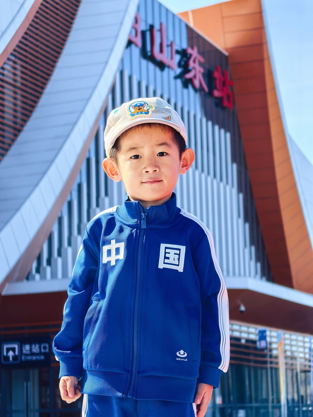 图为9月27日橡果小朋友在白山东站出站口处的打卡照片。旅程的序章始于前一日。9月27日清晨,我刚跑完一场半程马拉松,休息片刻,便载着橡果骑上山地自行车,从家门口出发,沿北安大街缓缓前行。11.37公里的路程,没有匆忙的赶路,只有秋风里的惬意与儿子雀跃的呢喃,最终顺利抵达白山东站。按相关规定,不满六周岁的橡果本可免票,但我还是特意为他买下人生中第一张半价火车票(2025年10月1日起,纸质火车票将正式退出历史舞台,所以,这也是他人生中唯一的一张纸质火车票)——这张小小的粉色票根,是他成长的纪念,更是属于父子俩的专属仪式。购完票后,我们在还未正式运营的白山东站站牌下、候车厅前拍了一张又一张打卡合影,镜头里的笑容,成了出发前最温暖的注脚。