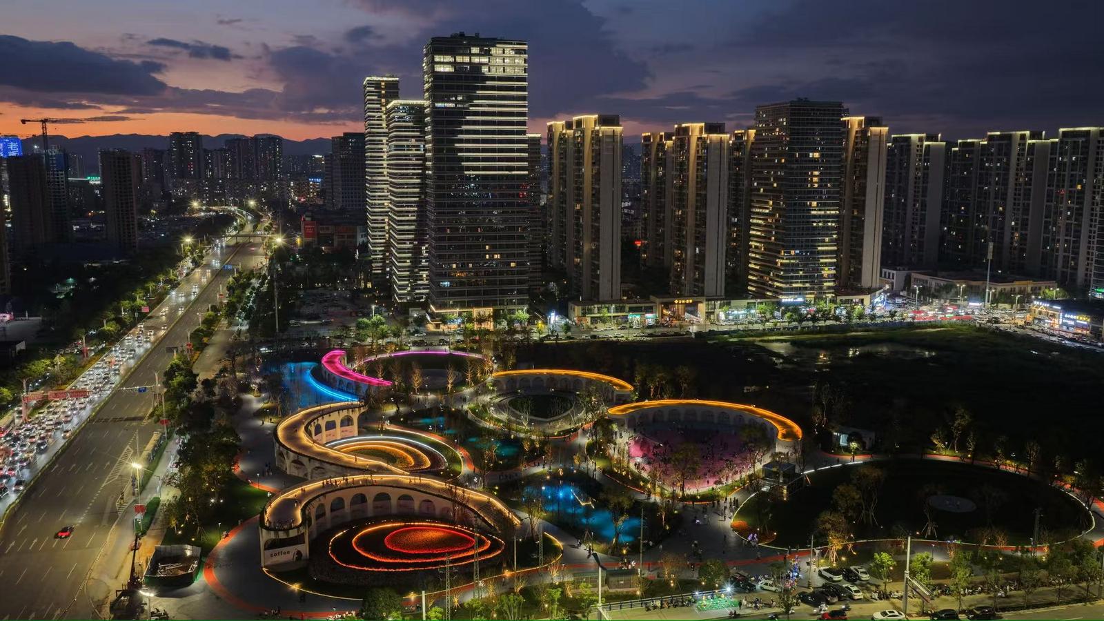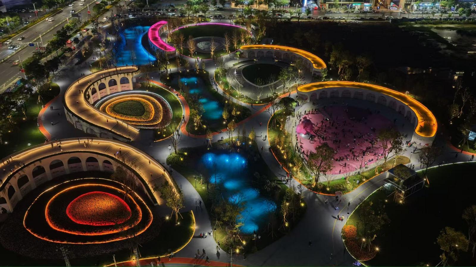 每日晚间7时,公园点亮如孔雀开屏般闪耀的璀璨灯带,给整座公园披上流动的霓裳,众多市民和儿童在此散步、嬉戏,一片热闹的场景成为巫家坝片区夜间最鲜活的生活图景。
