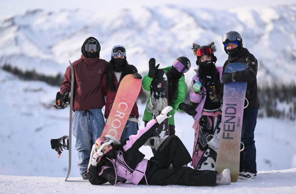 2025年1月28日,来自浙江的“95后”姑娘张琦彬(前)与一起滑雪过年的同伴们在新疆阿勒泰将军山国际滑雪度假区合影。新华社记者胡虎虎摄