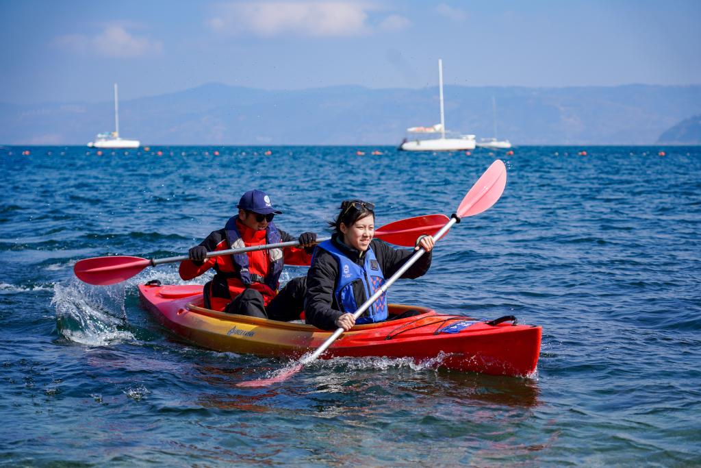 在云南省玉溪市抚仙湖,游客(右)在教练员带领下体验皮划艇。新华社记者王静颐摄