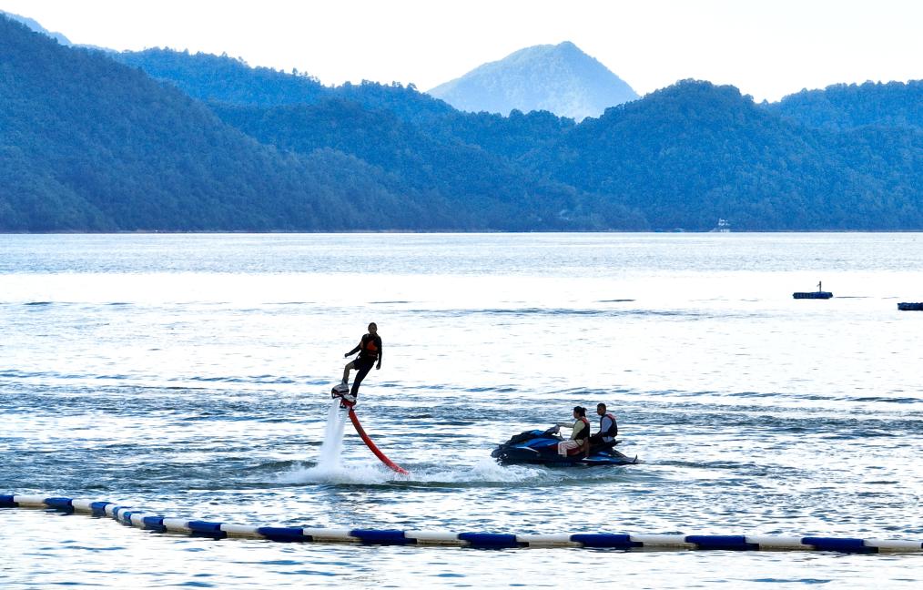 8月28日,游客在黄山市黄山区太平湖水上运动中心体验水上项目。新华社记者周牧摄