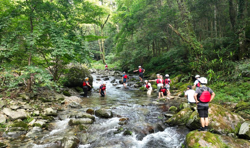 8月24日,游客在黄山市黟县五溪山风景区体验溯溪(无人机照片)。新华社发(汪澄摄)
