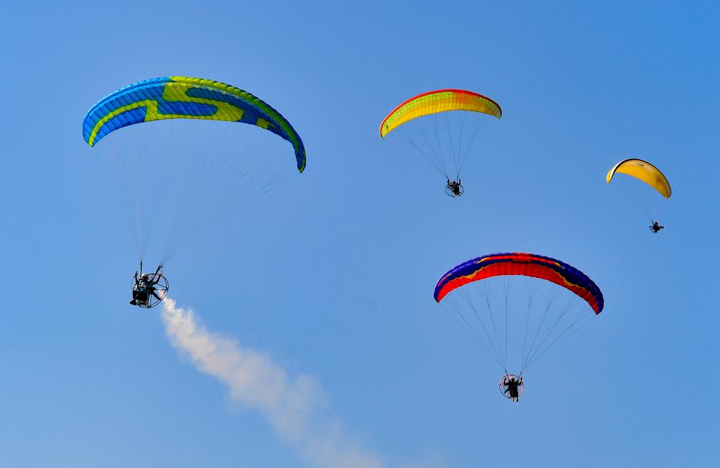 动力伞运动员在乌兰察布草原飞行大会上进行飞行表演。新华社发(王正摄)