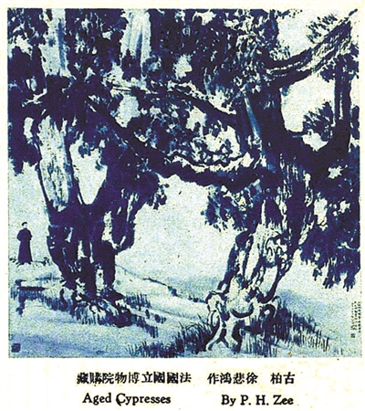 如本文前述,徐悲鸿于1947、1948两个年度,分别在南京北平两地所做两次讲演中,均以“北平的松柏树”为话题,借此表达自己的艺术理念与思想立场。那么,据《华北日报》报道可知,徐氏讲演中所谓“北平之所以美丽者,仅仗数千年来之古柏及白皮松而已”,又称“此二物从未在画家笔底出现,而仅本人于十五年前画二古柏,陈列于巴黎图书馆”云云,这一事实又究竟如何呢?