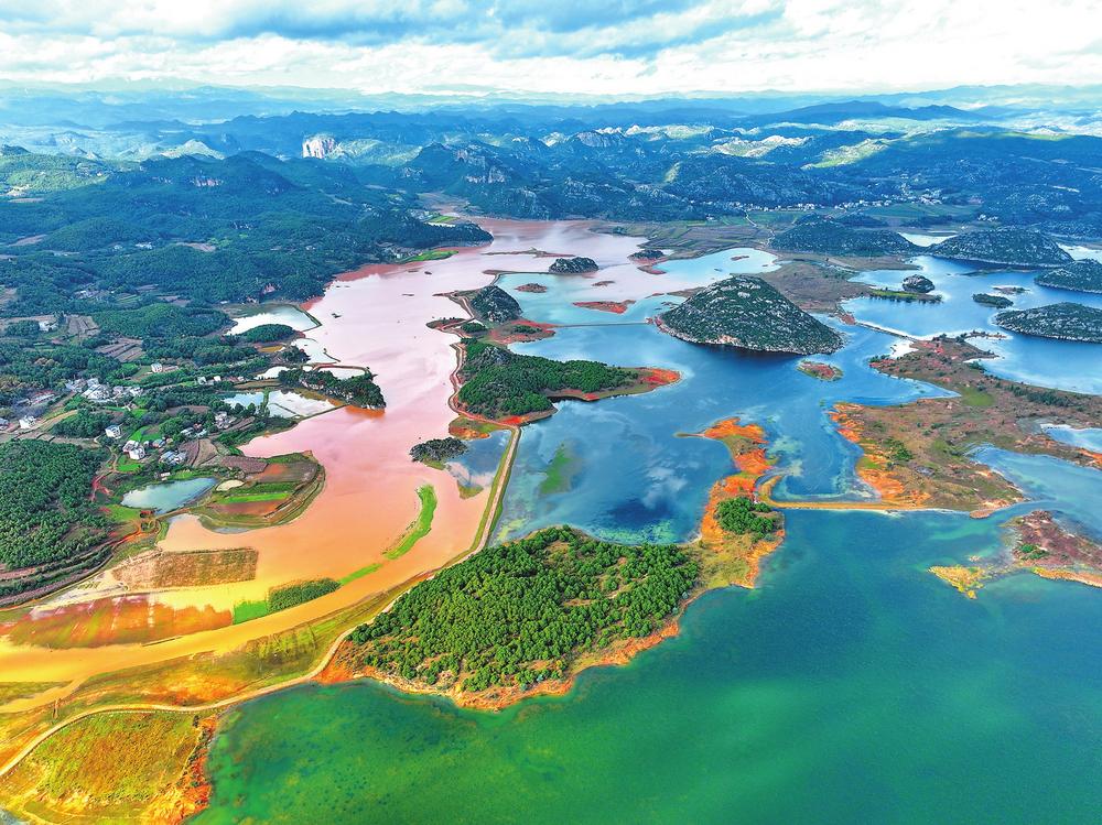 近日,大雨过后,曲靖市沾益区海峰湿地上演“鸳鸯锅”自然奇观。雨水将大量泥沙冲入大坡河与小东河,浑浊的河水随后流入湿地的陆柴坪、烂石坡等区域,与环湖路东南侧清澈见底的湖水相遇,构成了一清一浊的鲜明对比。