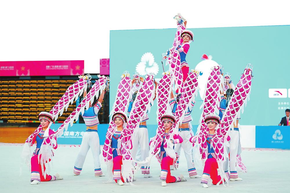 云南队在十五运会群众展演舞龙舞狮项目比赛中。 记者周灿/摄