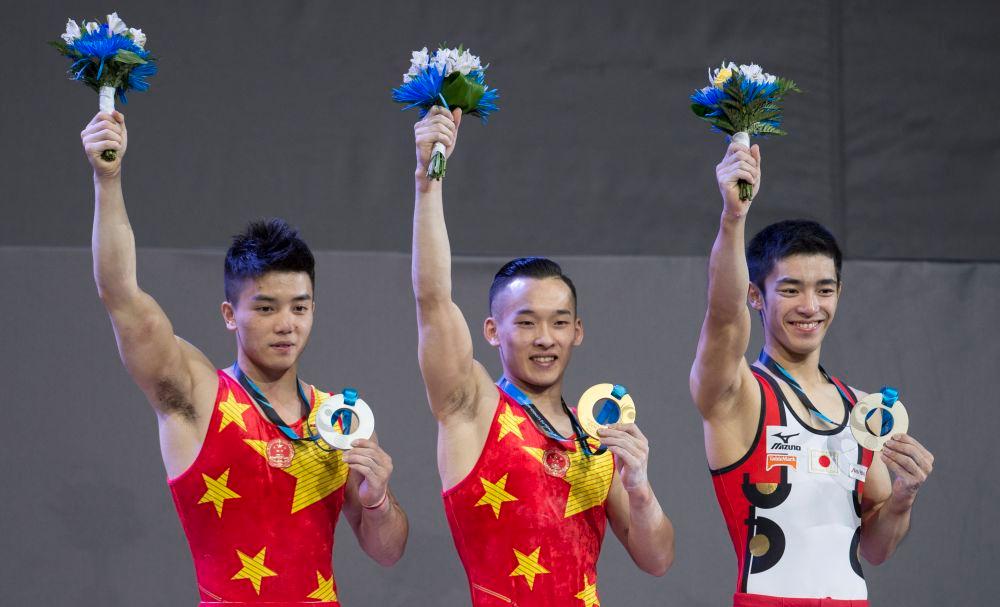 2017年10月5日,冠军肖若腾(中)、亚军林超攀(左)和季军日本选手白井健三在世界体操锦标赛男子全能颁奖仪式上。新华社发然而
