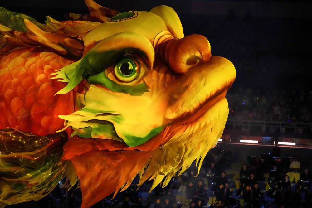这是11月9日拍摄的第十五届全国运动会开幕式现场表演上的鳌鱼。 新华社记者 赖向东 摄鳌鱼与龙、凤、麒麟