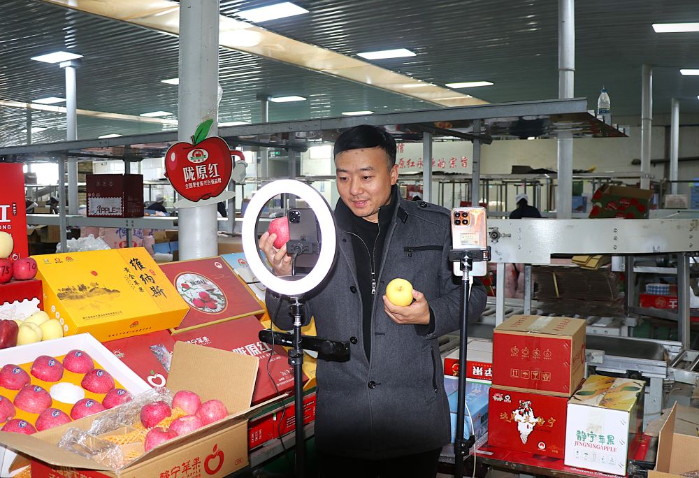 11月11日,在甘肃省平凉市静宁县工业园区的一家苹果企业,网络主播在推介静宁苹果。新华社发(王毅摄)