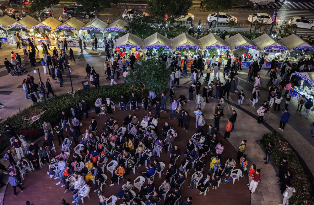 11月7日,依托当晚在西施篮球中心举办的系列演唱会,“陶你所需·朱市云集”社区共富市集吸引了大批市民游客(无人机照片)。新华社记者 徐昱 摄