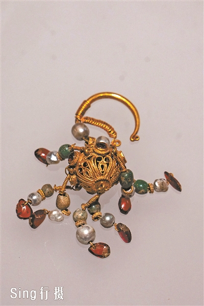 结合1983年扬州出土的唐代嵌宝石金耳坠,能想象到舞女的耳饰有多么漂亮。扬州这枚耳坠,由挂环、镂空金球和坠饰三部分组成,上部挂环穿横环,相连金球腰部焊了对称相间的嵌宝孔和小金圈各六个,部分嵌宝孔内还保留红宝石和琉璃珠等;下部有七根相同的坠饰,六根系在金球腰部的小金圈上,一根挂在金球下端中心的金圈上。每根坠饰的上段均做成弹簧状,中段穿一花丝金圈、珍珠和琉璃珠,其下坠一红宝石。