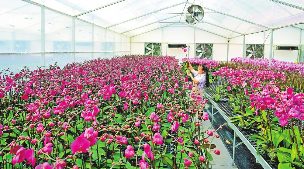 位于玉溪市江川区九溪镇的亚洲花卉科创谷,以花卉科创研发为核心,以数字产业化和产业数字化为支撑,促进花卉全产业链发展。科创谷集聚了9家优势农业企业,农业设施面积达955亩,带动周边农户增收超1200万元。图为科创谷内的云南绿聚隆生物科技有限责任公司智能温室里,工人正在管护蝴蝶兰。(云南日报通讯员 曾永洪 摄)