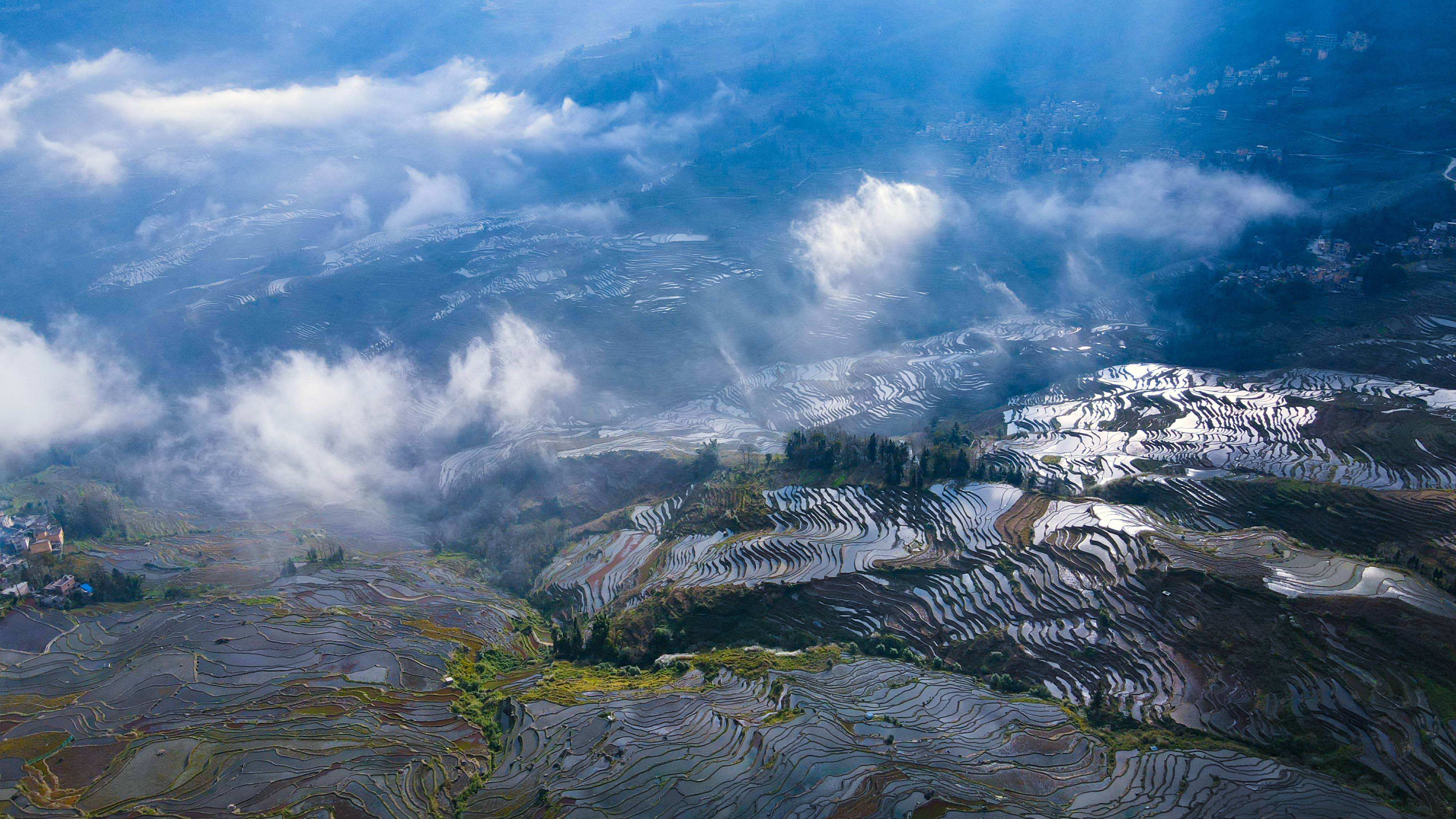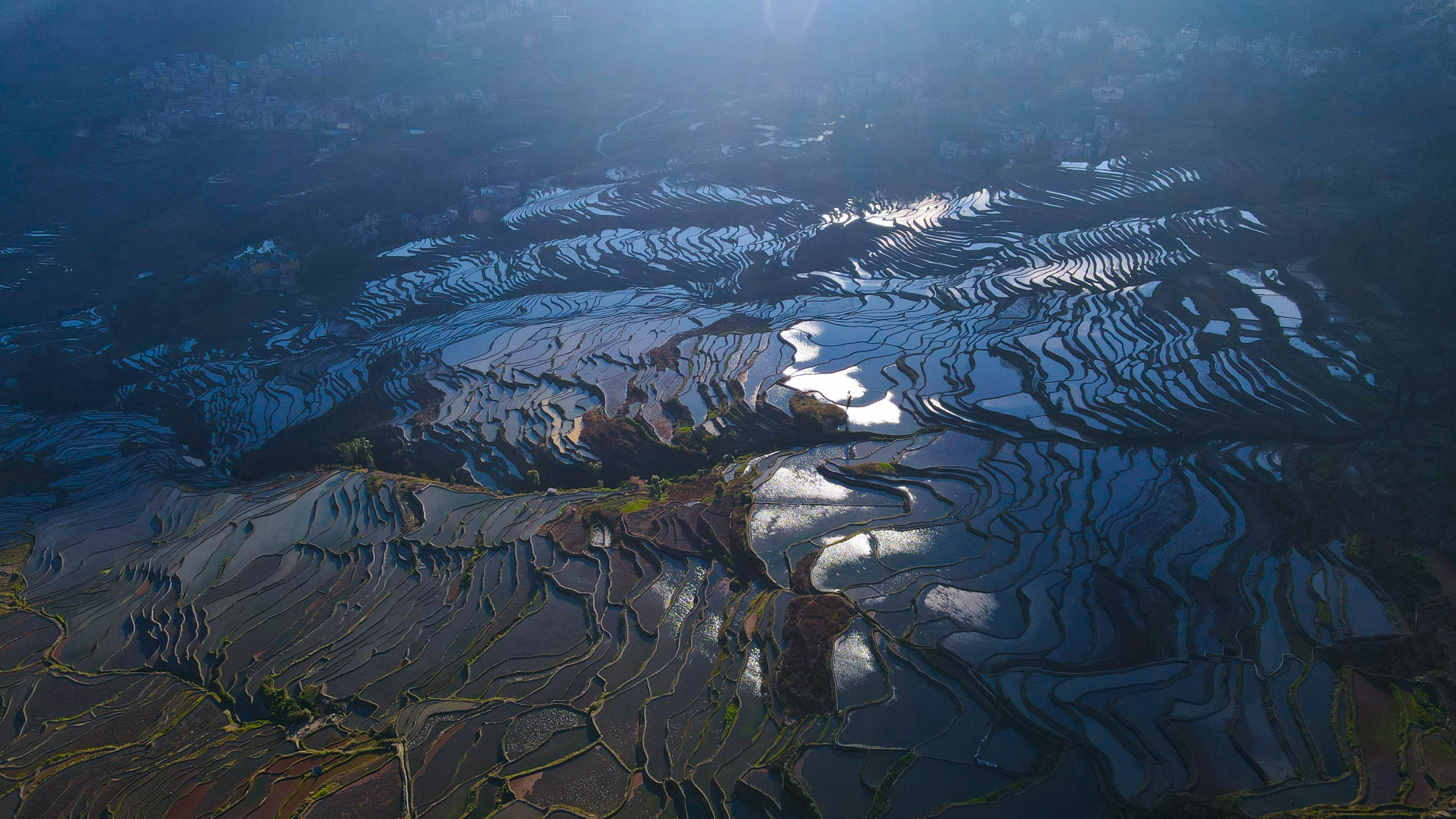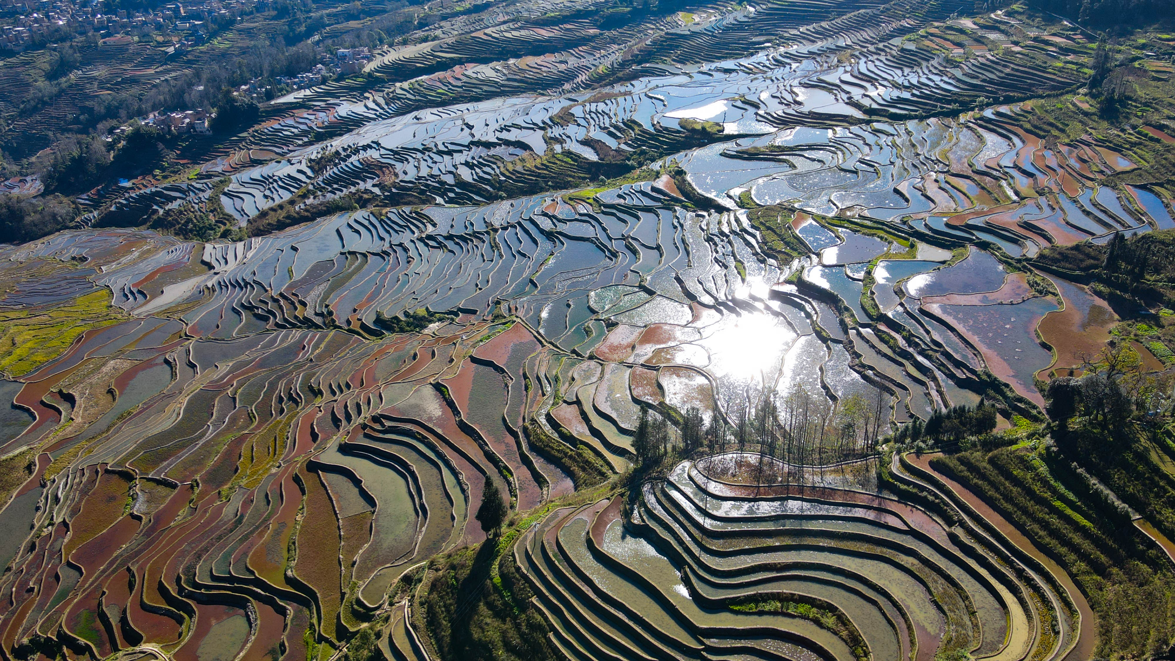 眼下农户们趁农闲完成翻耕灌水,让梯田维持在景色最优的蓄水状态。这片承载着千年农耕文明的土地,以“森林、村寨、梯田、水系”四素同构的生态系统,勾勒出人与自然和谐共生的画卷,成为冬季云南旅游的热门地标。