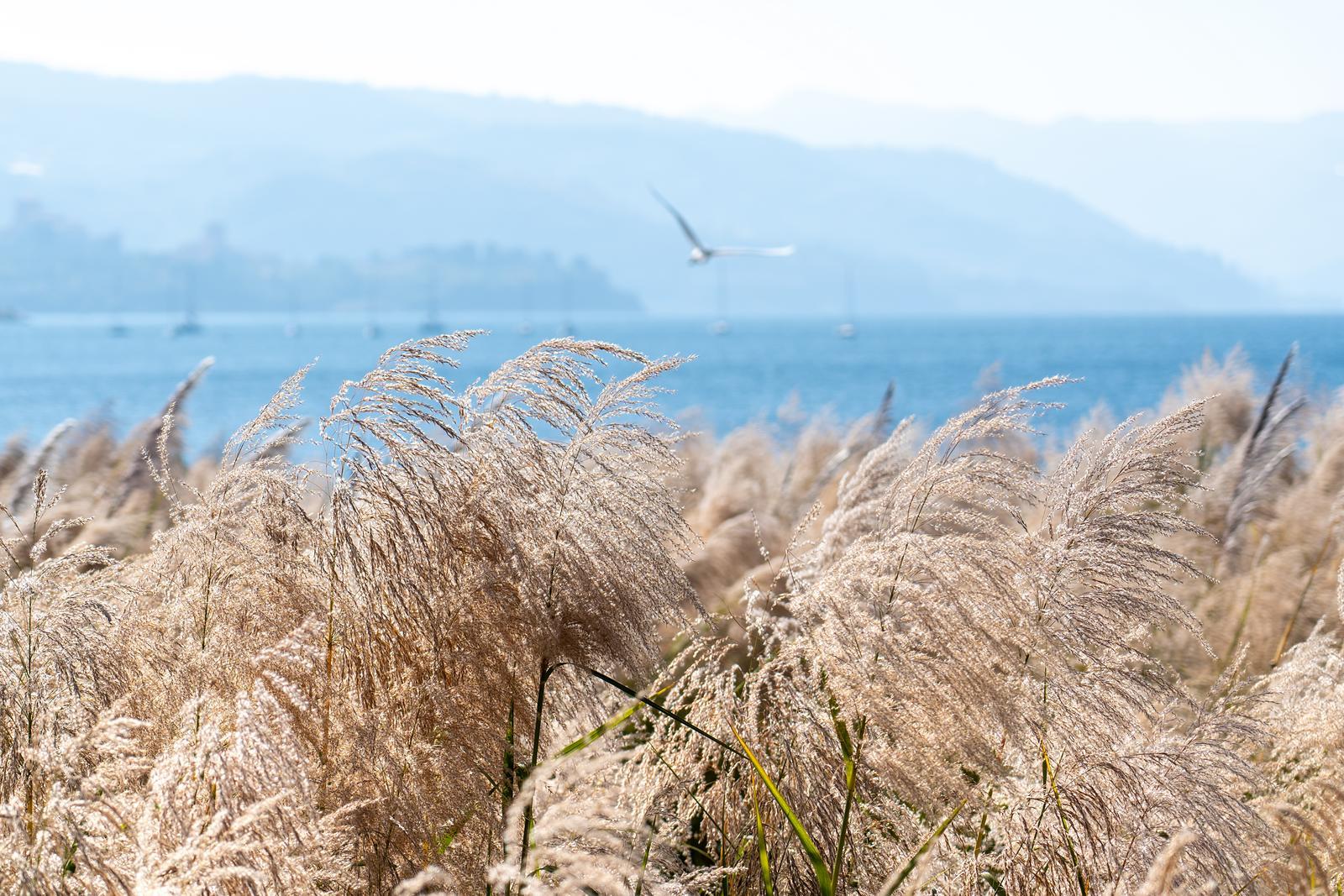 午间,湖畔成片的芦苇荡在阳光下泛出淡淡的黄,随风摇曳,偶尔,一叶帆船悠悠驶入视野,或是一群海鸥翩然飞过,为这幅静谧的画面添上几分灵动与悠远。