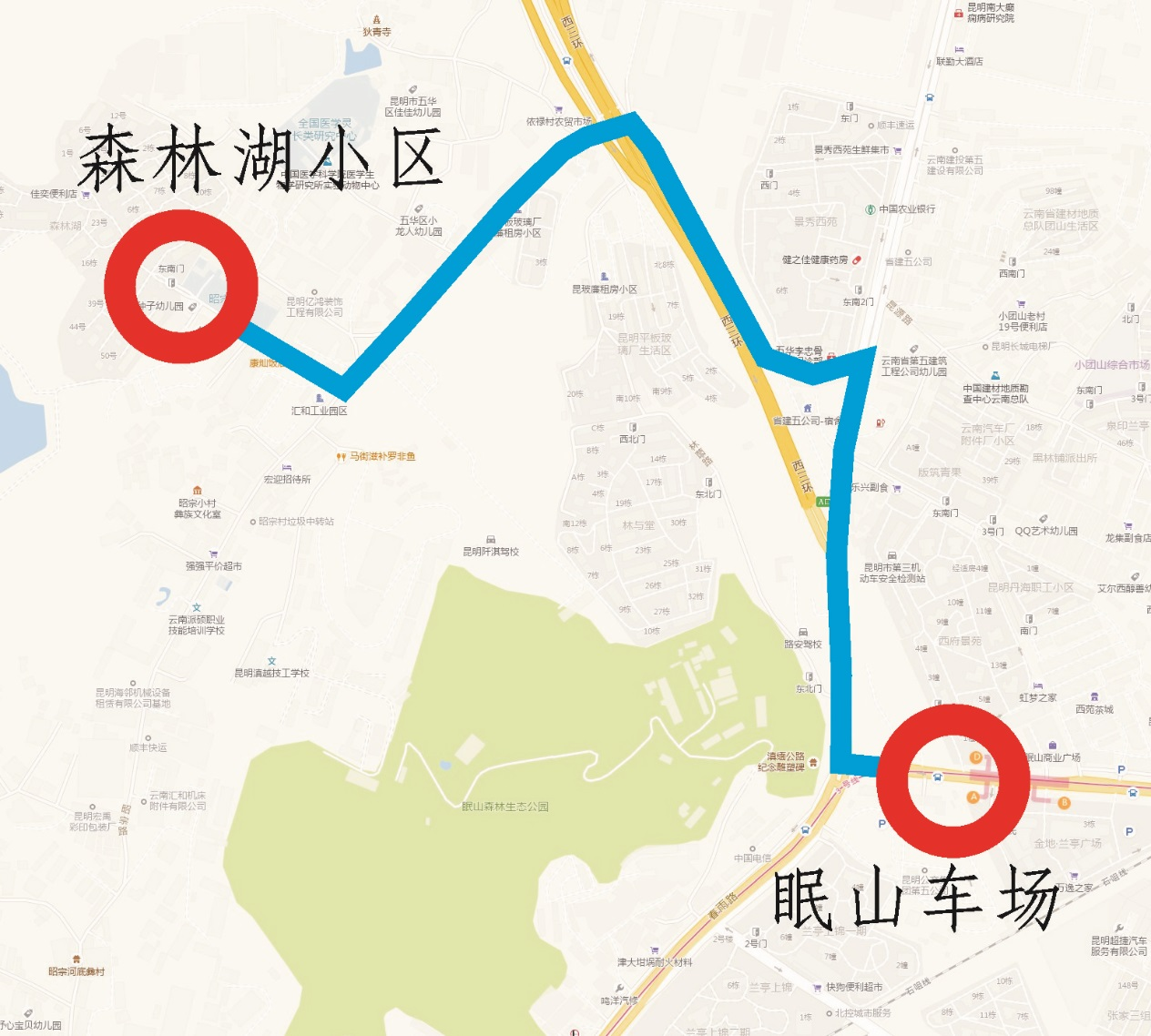 途经站点:森林湖小区(起始站)、眠山车场(终到站)。