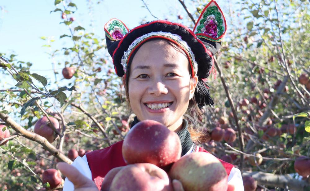 宾川县排营村党总支副书记李丽晴展示苹果。 本报通讯员 邓永凤 摄