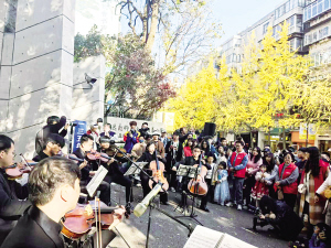 当日午后,文林街师大附小门口已被金黄色银杏叶铺满,昆明交响乐团在这片“金色海洋”中开启首场演出。下午3点半,弦乐四重奏的悠扬旋律缓缓流淌,穿透银杏树枝叶间的阳光,与灵动翻飞的黄叶相映,将街道化作露天音乐厅。这场艺术表演吸引大批市民、游客驻足,大家纷纷举起手机定格美好瞬间。
