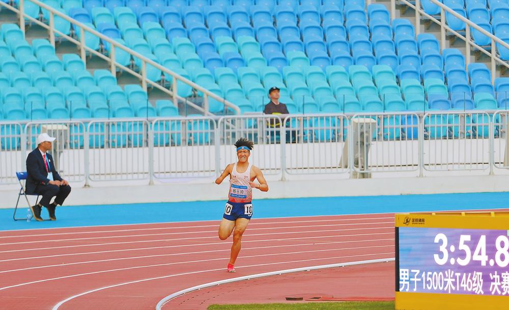 云南残疾人中长跑名将李朝燕与杨玉帅共同出战男子1500米T46级决赛。起跑阶段,李朝燕领跑队伍;第二圈,杨玉帅加快赶超,与李朝燕齐头并进;最后一圈,杨玉帅迅速调整发起冲刺,最终以4分12秒54的成绩斩获该项目金牌,这也是他连续第三次获得该项目冠军。