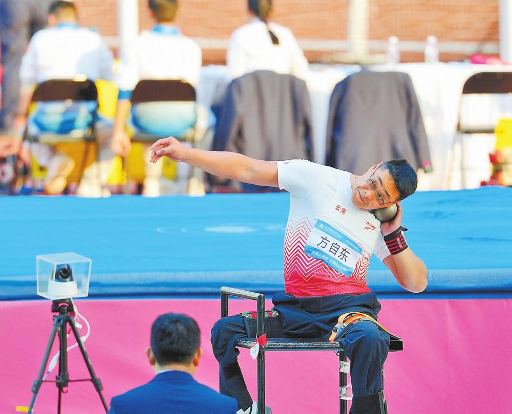 在男子铅球F55级决赛现场,云南选手方自东与来自甘肃、山西、陕西、宁夏等地的11位选手同场竞技。第一投,方自东投出了10.80米的成绩;最后一次投掷,他抓住机会以11.62米的成绩赢得该项目银牌。