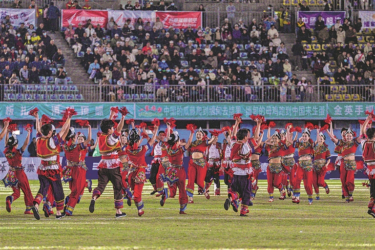 文艺表演率先拉开盛宴序幕。合唱《大中华》震撼犹在,身着傣族、景颇族等民族服饰的演员踏歌而来。德宏队队歌《边境之光》悠扬唱响,随后融入了傣剧元素的表演伴着古典音乐以现代的表演方式再现少数民族璀璨文化,全民歌曲《样样好》《如哩金旺》响起,傣家青年姑娘身着艳丽服饰,踏着轻快舞步欢快起舞,灵动裙摆随节奏翻飞,球迷观众纷纷跟着旋律鼓掌附和,歌声掌声交织成欢乐乐章。