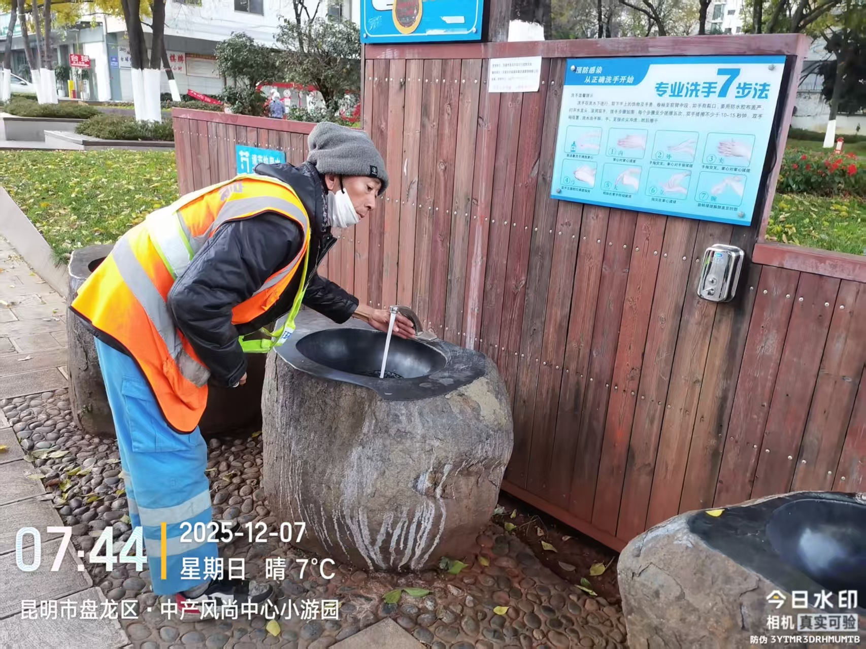 “最困难的是部分老旧小区周边的洗手台,管网老化严重。我们联合昆明水务集团技术人员现场勘查,重新铺设了1200多米供水管网,才解决了停水问题。”樊华展示的设施档案中,每处洗手台的位置、建设时间、管护单位、维修记录等信息一目了然。例如,广福路香槟小镇小区口的洗手台于11月完成水管更换和皂液器维修,12月5日复查显示“正常使用”。