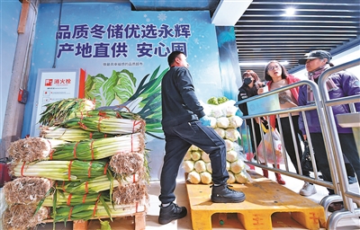▲为满足不同消费者,北京永辉超市百子湾路店结账区外还有成包销售的白菜、大葱