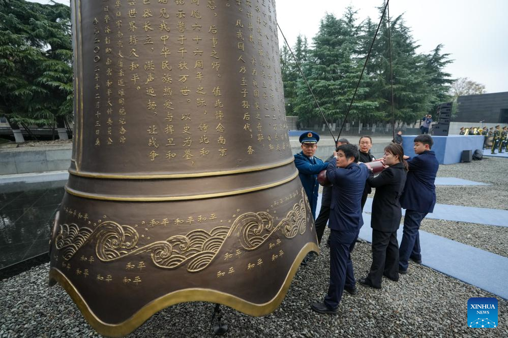 People strike the Bell of Peace during a national memorial ceremony for the Nanjing Massacre victims held at the Memorial Hall of the Victims in Nanjing Massacre by Japanese Invaders in Nanjing, capital of east China's Jiangsu Province, Dec. 13, 2025. The 12th national memorial day was observed in Nanjing on Saturday to honor about 300,000 victims killed by Japanese troops during the Nanjing Massacre, in a year that marks the 80th anniversary of the end of World War II (WWII). (Xinhua/Li Bo)